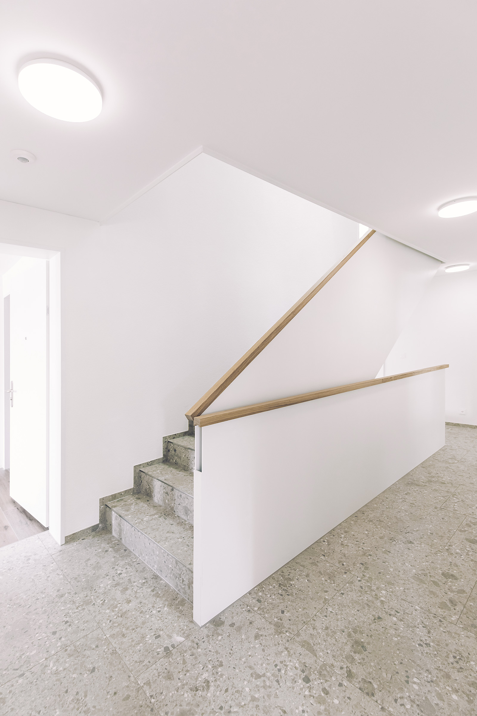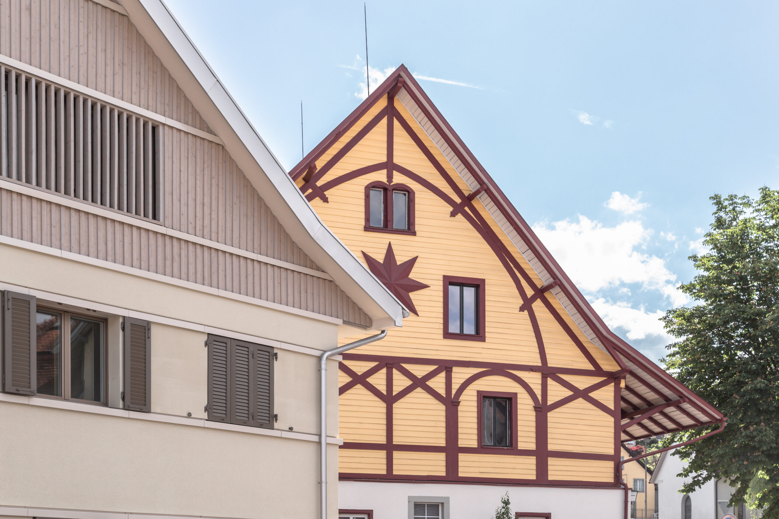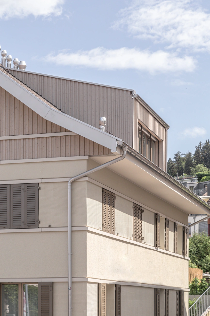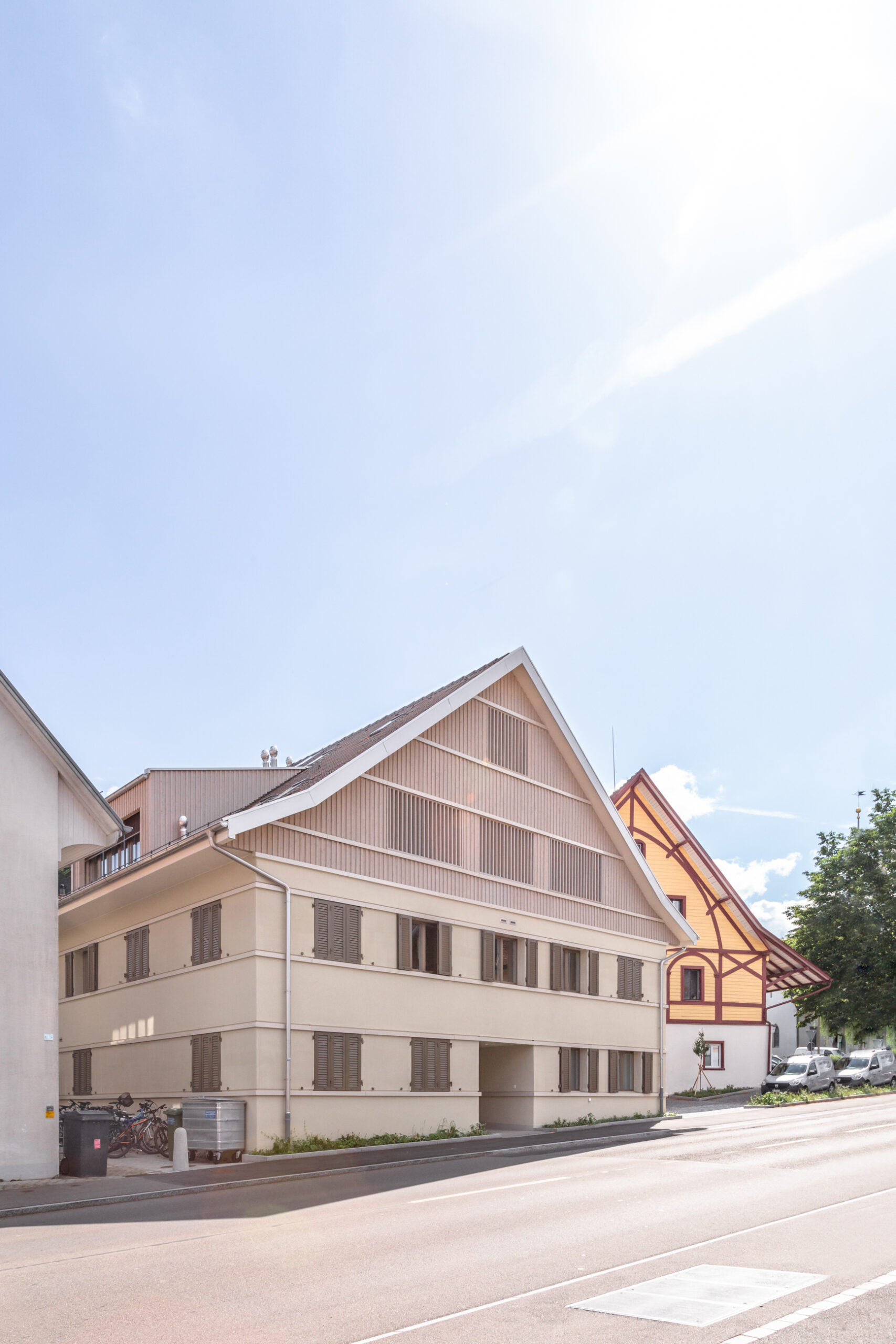 In der Kernzone der Gemeinde Fällanden entsteht ein hochwertiges und modernes Mehrfamilienhaus. Dieses Wohnhaus wahrt mit seiner Form das typische Ortsbild und weist gleichzeitig moderne Elemente auf. Das Dach ist mit der gewählten Materialität traditionell gestaltet, jedoch entspricht die Glasfront hinter den vertikalen Holzlamellen den aktuellen Wohnbedürfnissen nach grosszügigen und hellen Räumen. Die vertikalen Holzlamellen nehmen den Charakter des Ortes auf und schützen zudem vor Sonne und absorbieren den Strassenlärm. Die angrenzenden Nachbarhäuser und die Kantonstrasse verlangen erhöhte Anforderungen an den Brand- und Lärmschutz. Dennoch gelang es, moderne und gut geschnittene Grundrisse für alle Wohnungen zu planen. Während das Giebeldach die vertikale Form betont, wird der ruhige Sockelbereich in Kontrast dazu horizontal geformt.