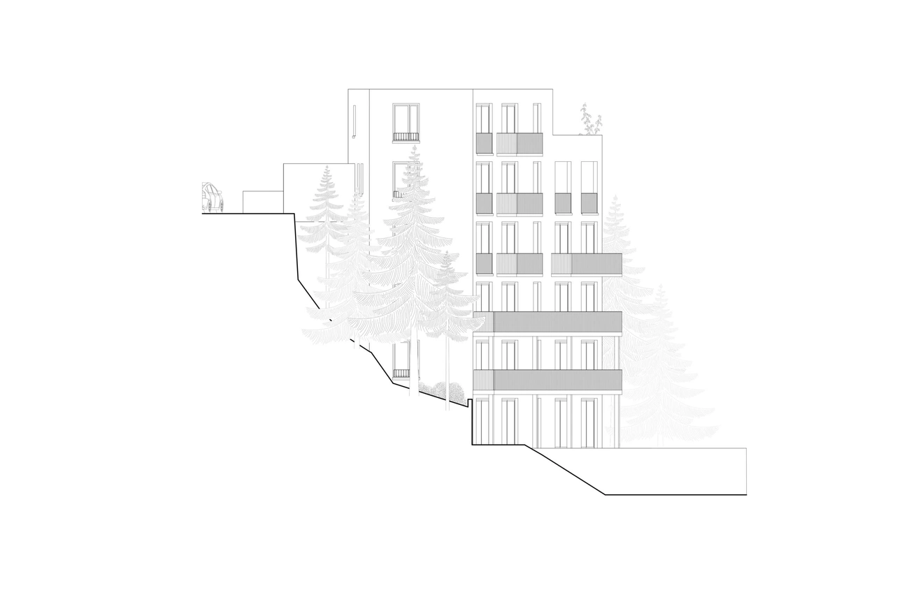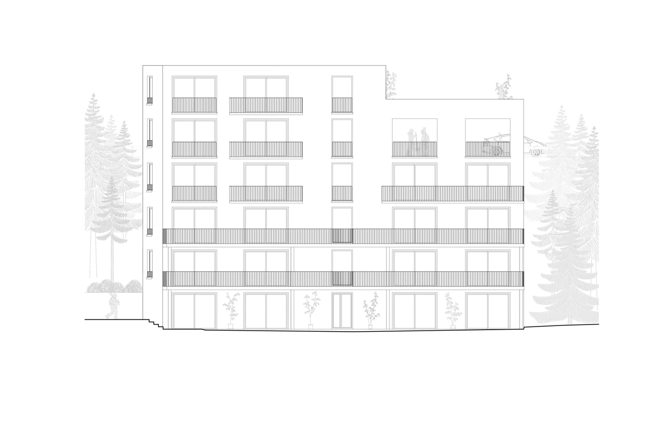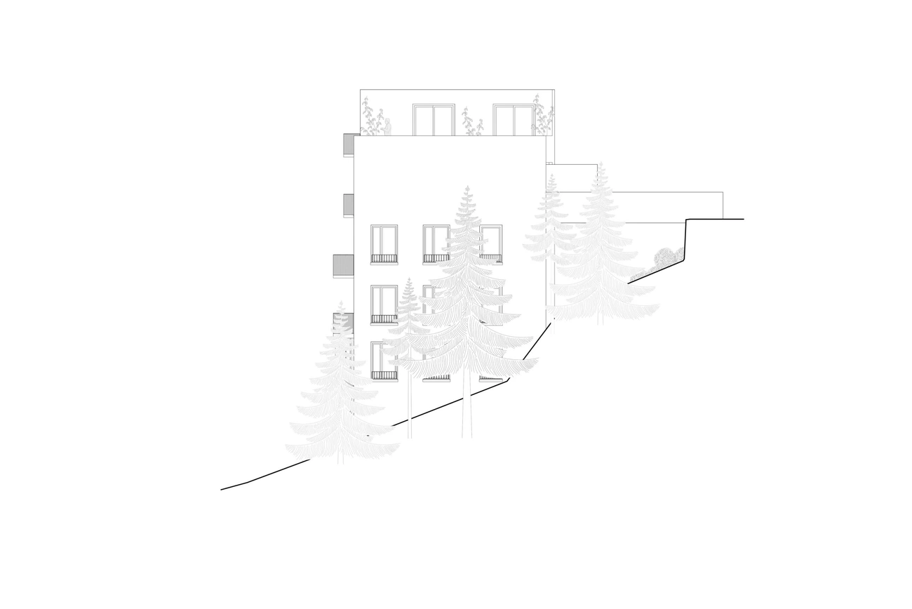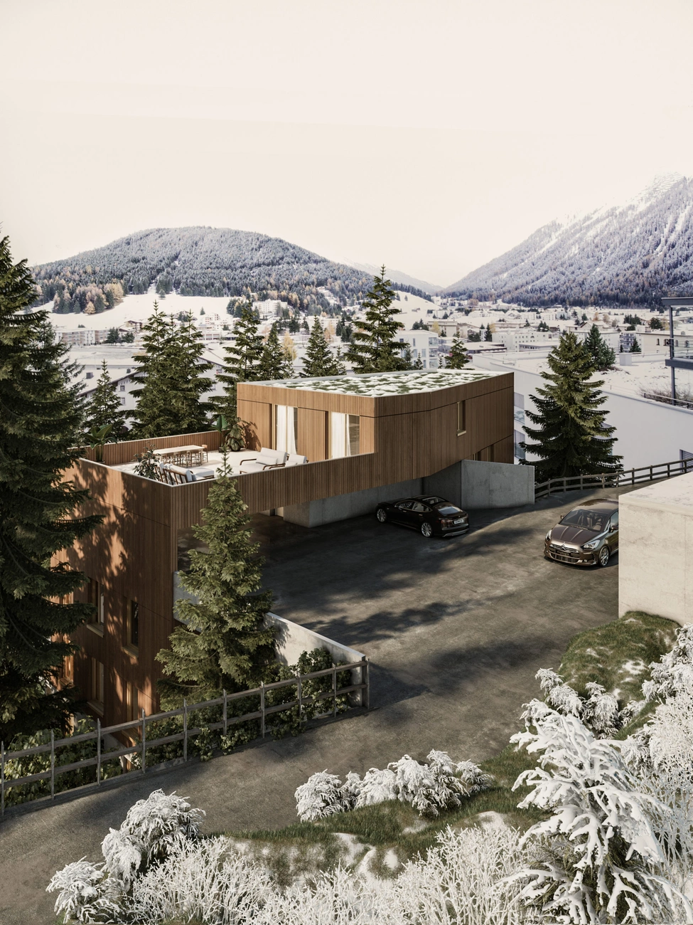 Der Neubau an der Salzgäbstrasse am kleinen Davos Dorf, ist ein MFH von 7 Wohnungen die eine Südost Situation haben. Da die Parzelle steil ist, wird das Gebäude am Berg angepasst.