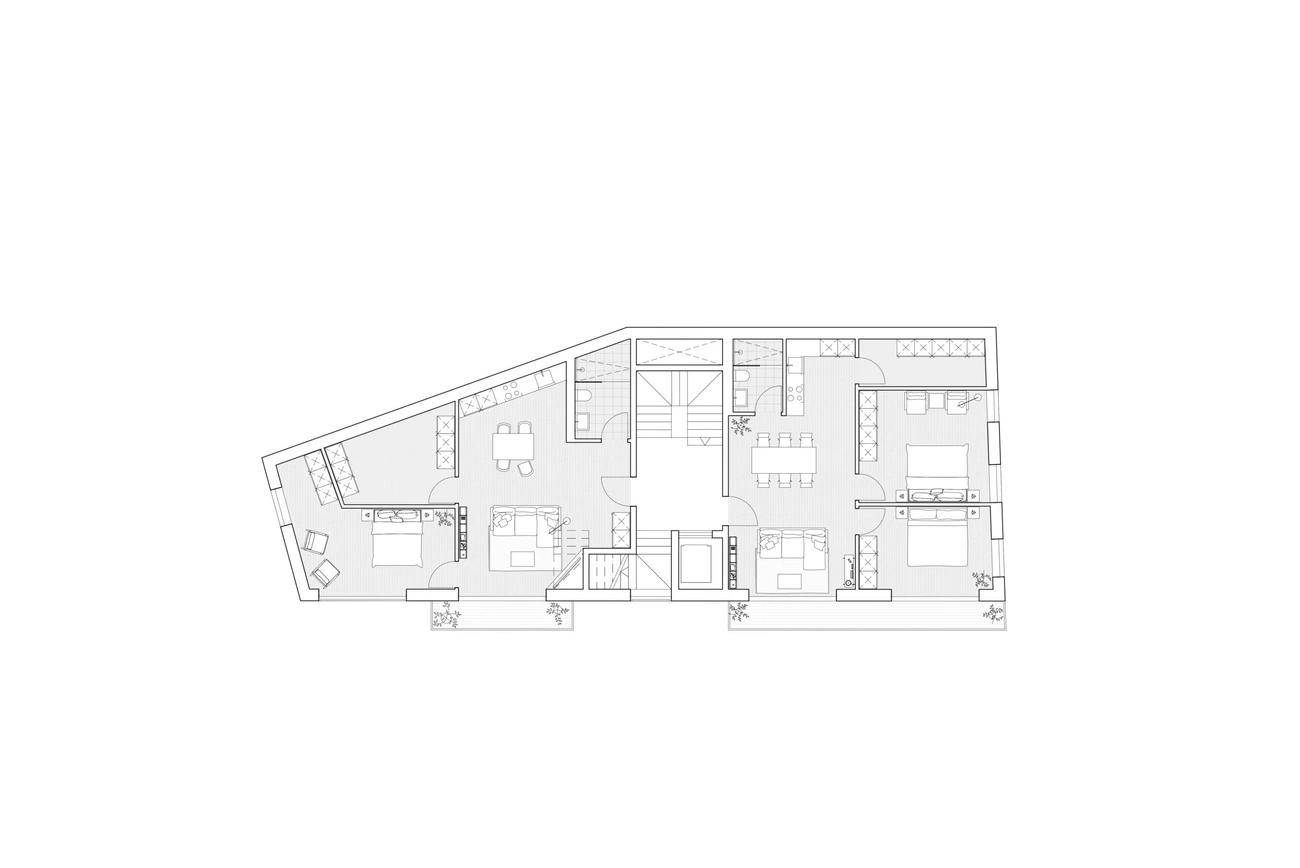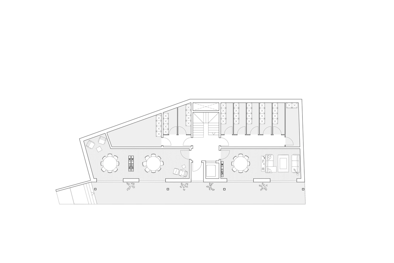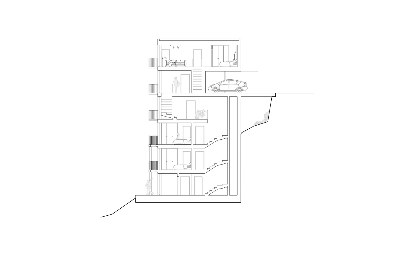 Das Projekt besteht aus zwei oberirdische und vier unterirdische Geschosse. Das Erdgeschoss wird als Parkplatz verwendet, im Erstgeschoss haben wir eine Wohnung mit einer grossen Terrasse. Die weiteren sechs Wohnungen werden vom ersten bis zum dritten Untergeschoss verteil. Der Vierte Untergeschoss enthält ein Gewerberaum der einen direkten Ausgang mit dem Innengarten hat.