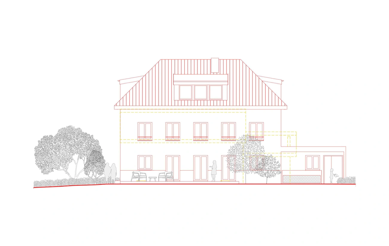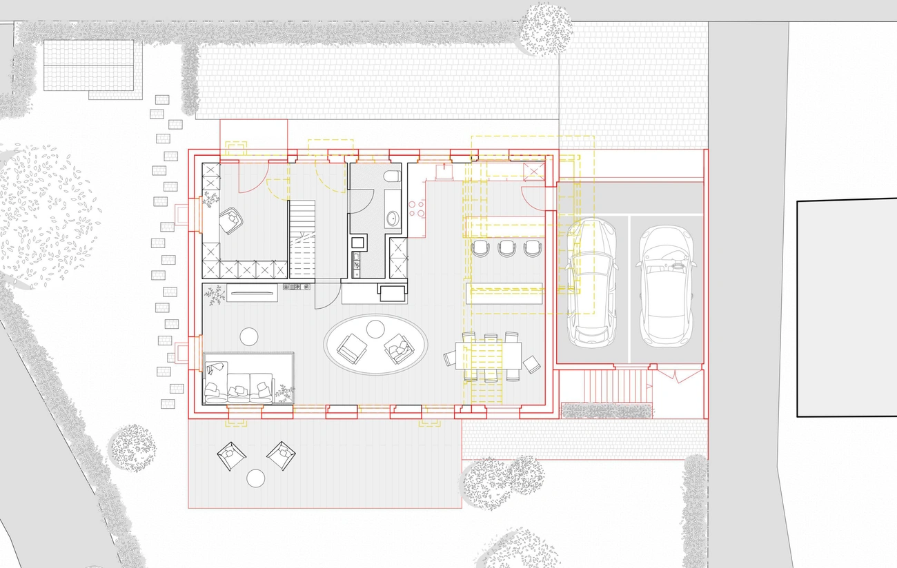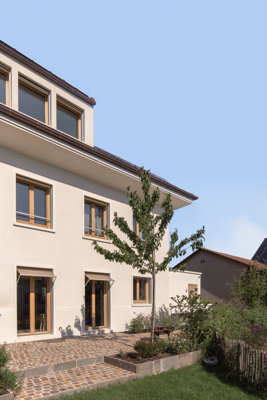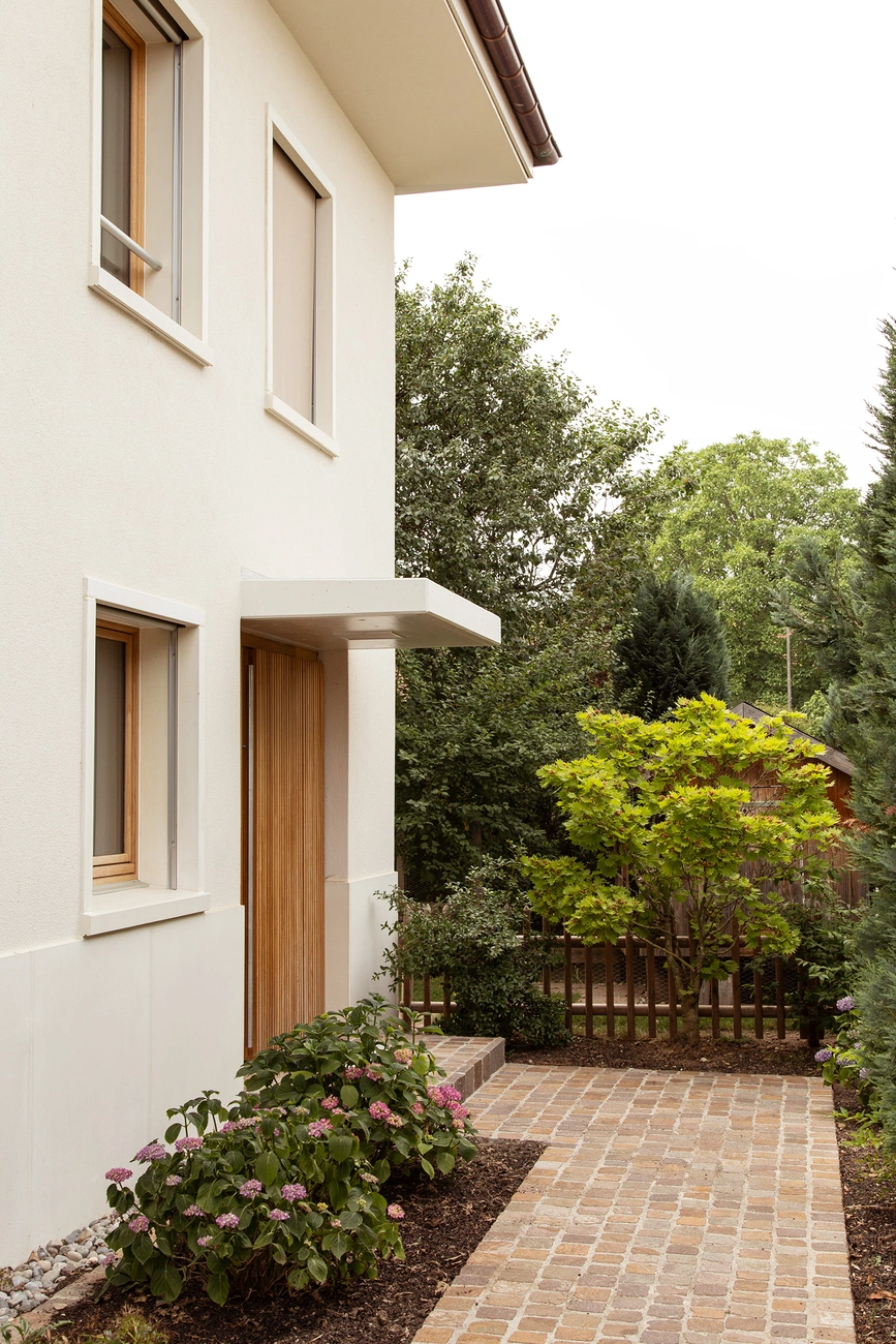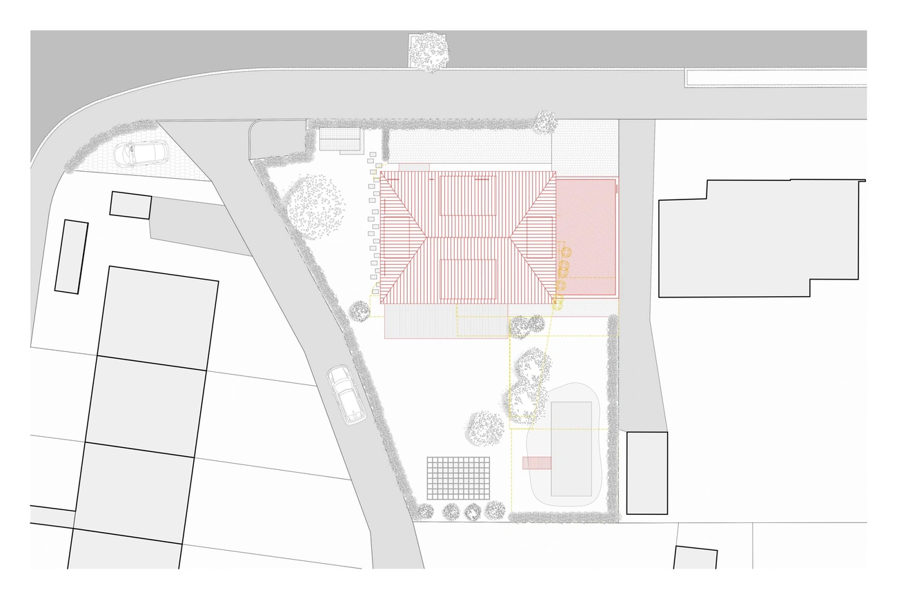 Dieses Haus befindet sich in einer Umgebung, in der Häuser ohne besondere Rücksicht auf ihre Umgebung gebaut werden – gebaut wie Objekte inmitten eines Grundstücks. Daher war die Idee des Städtebaus, ein sehr präzises Volumen zu schaffen, das das Haus völlig neu ausrichtete: die Hauptausrichtung des Gebäudes zu verändern, es in Richtung seines grossen Gartens zu lenken und einen Abschluss zur Hauptstrasse zu schaffen. Die Konstruktion ist einfach, aber anspruchsvoll.