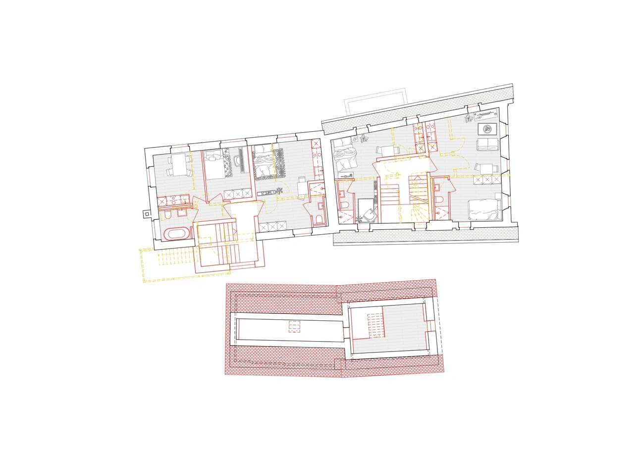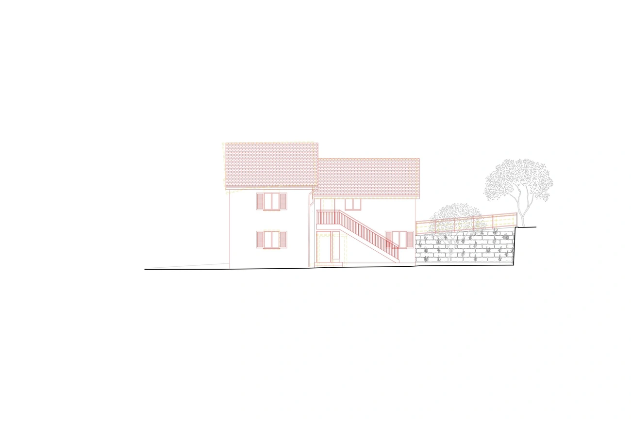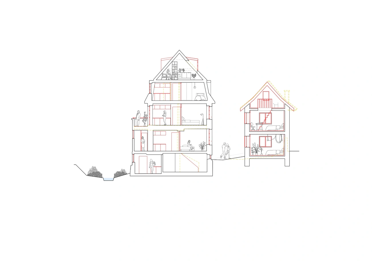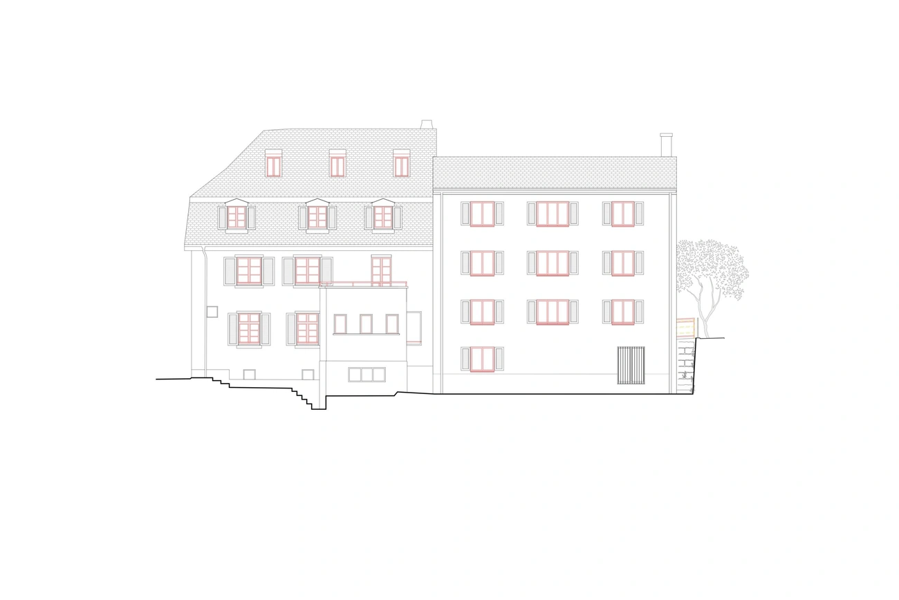 Auf der Parzelle befinden sich ein viergeschossiges langes Gebäude und daneben ein dreigeschossiges kleines Gebäude. Innerhalb des Gebäudeensembles wurden 14 Wohnungen und 2 Büros umgebaut. Zusätzlich wurden ein neues Treppenhaus und mehrere Gauben angebaut. Die beiden Gebäude befinden sich in der Kernzone, in unmittelbarer Nähe zum Zentrum.