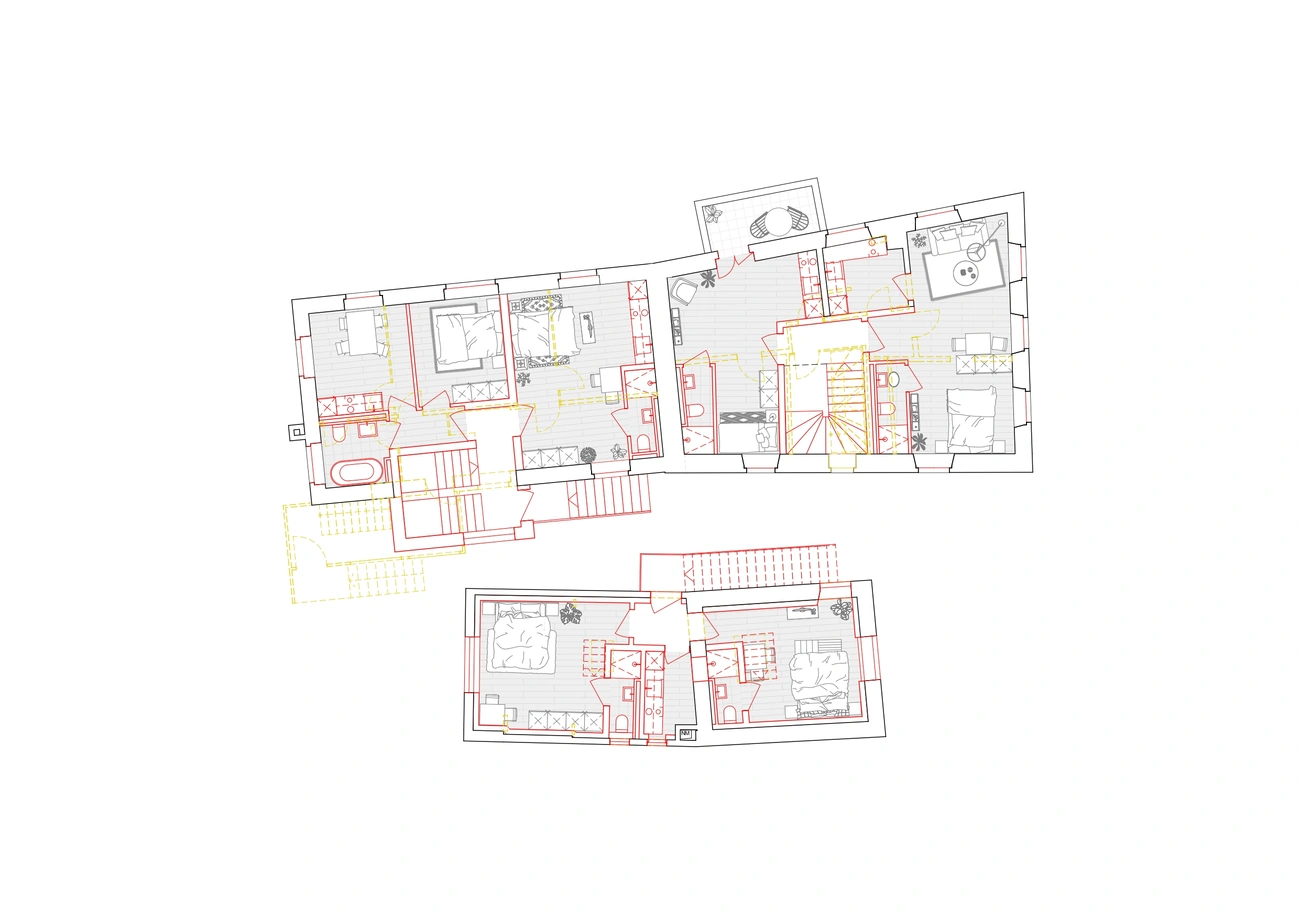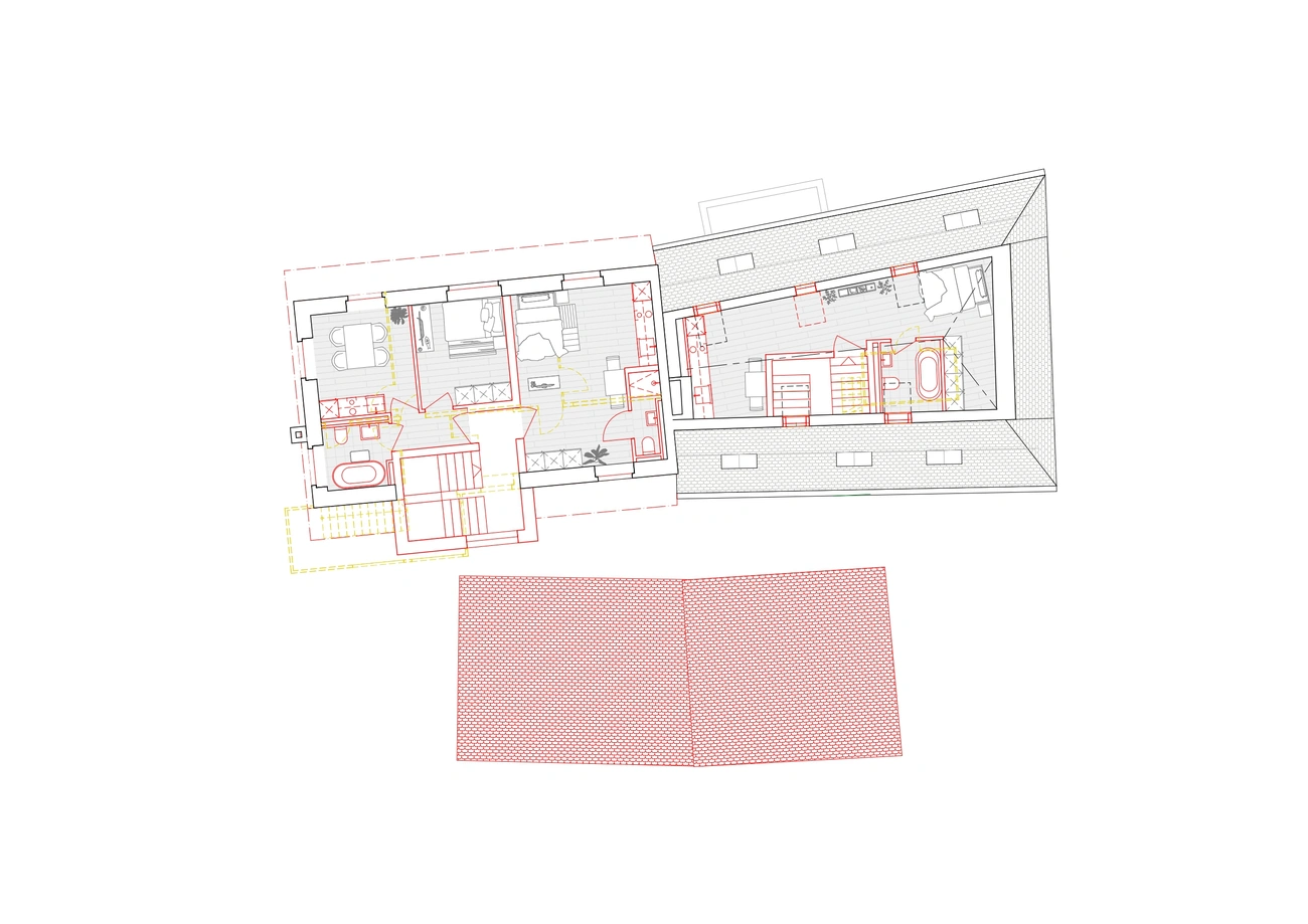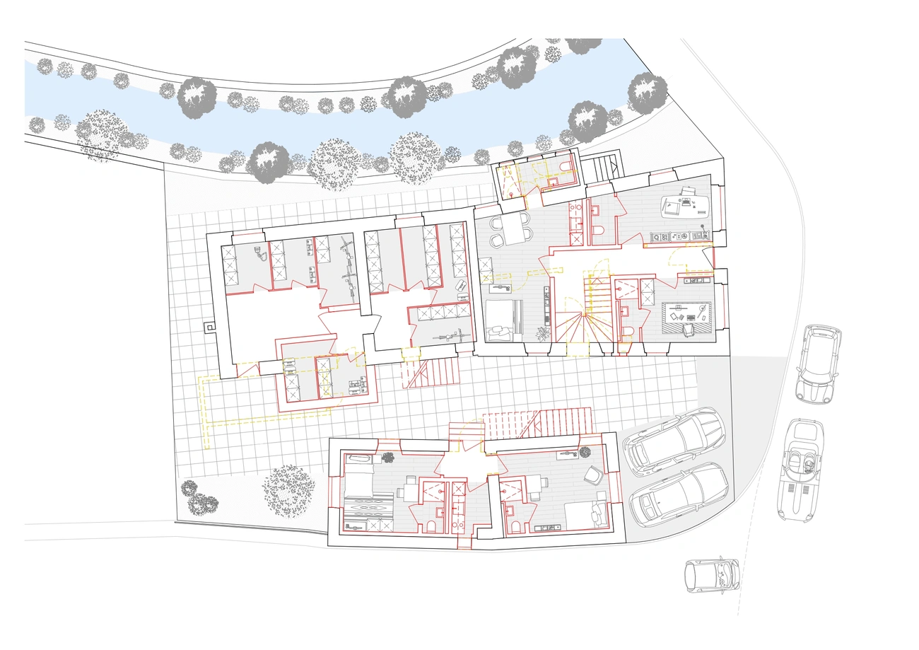 Auf der Parzelle befinden sich ein viergeschossiges langes Gebäude und daneben ein dreigeschossiges kleines Gebäude. Innerhalb des Gebäudeensembles wurden 14 Wohnungen und 2 Büros umgebaut. Zusätzlich wurden ein neues Treppenhaus und mehrere Gauben angebaut. Die beiden Gebäude befinden sich in der Kernzone, in unmittelbarer Nähe zum Zentrum.